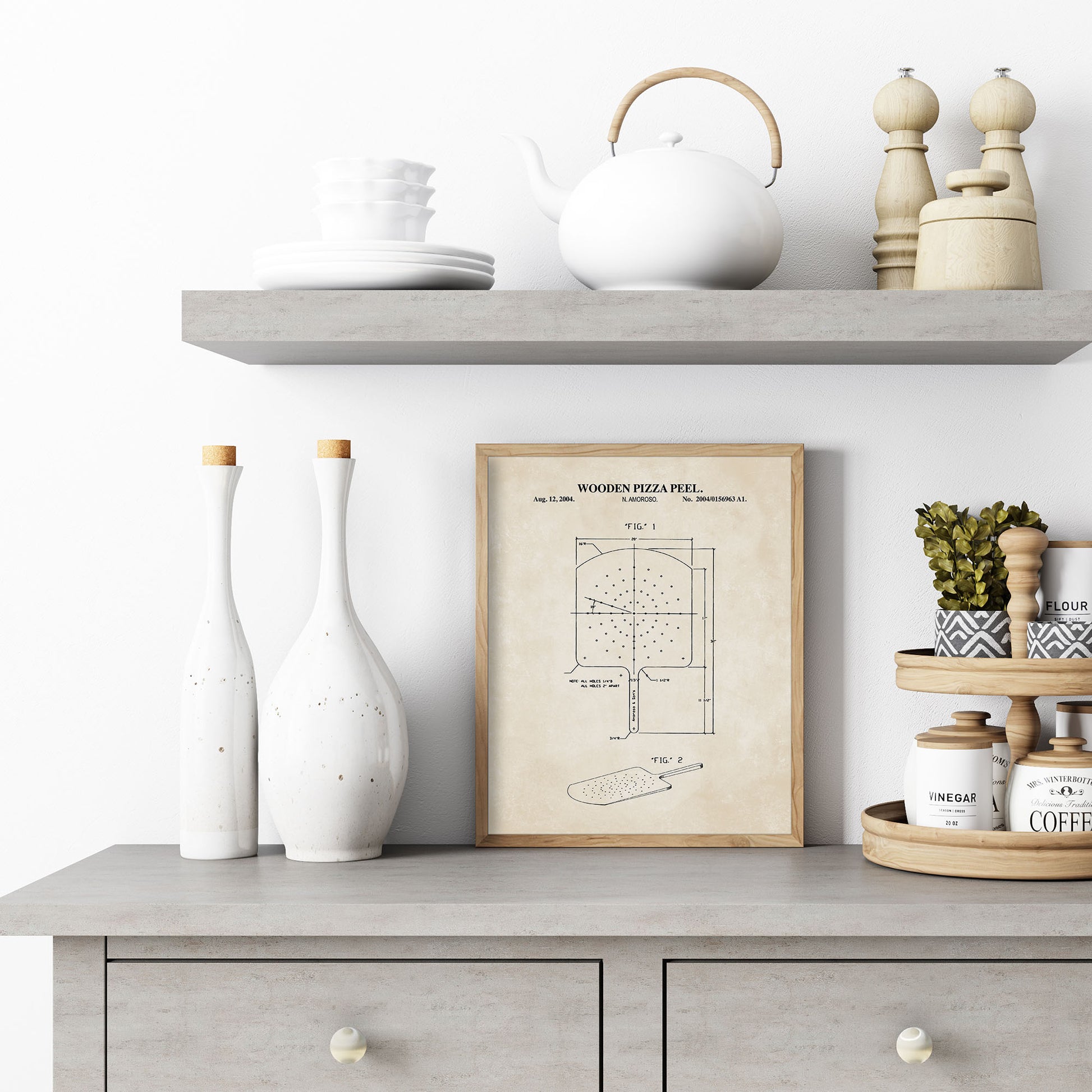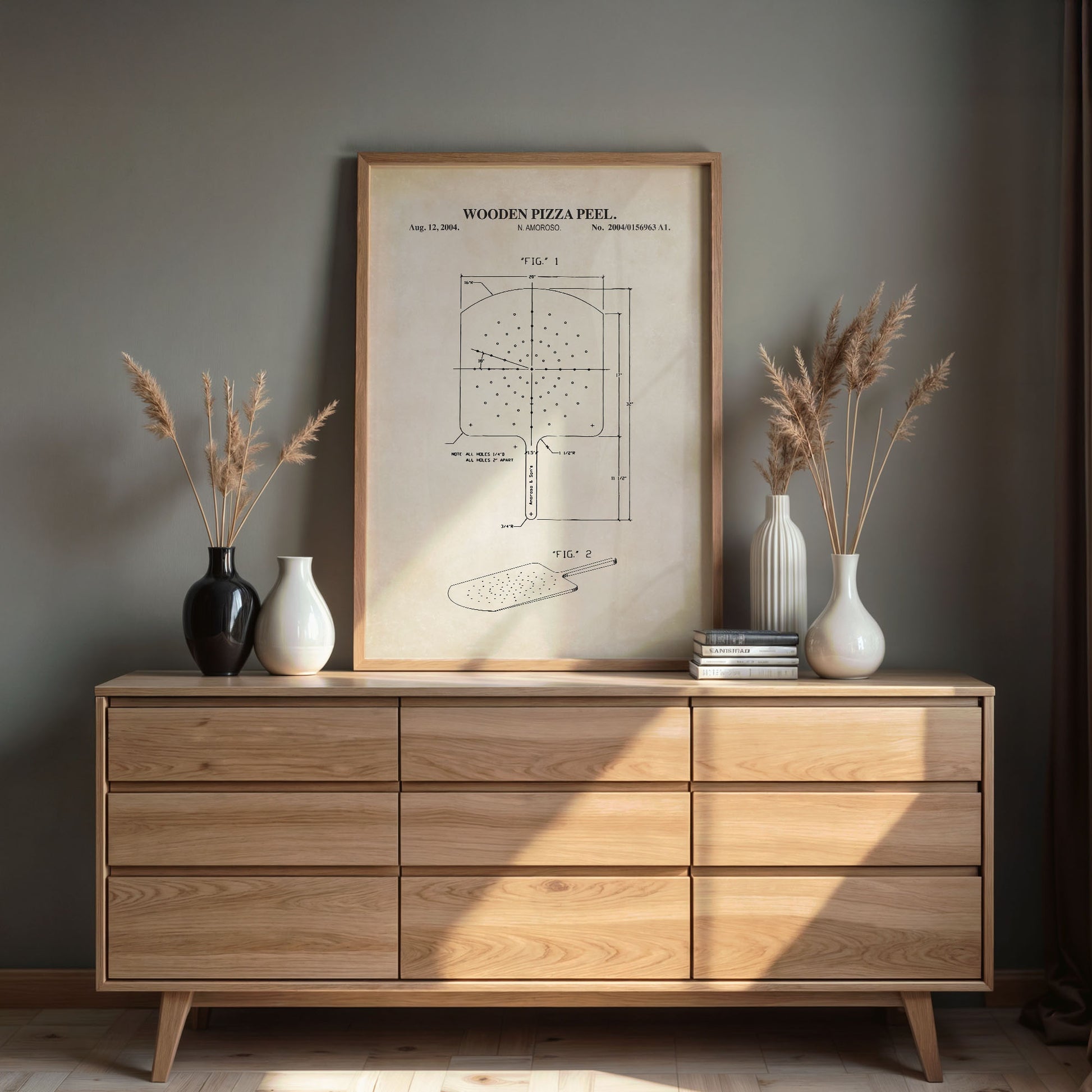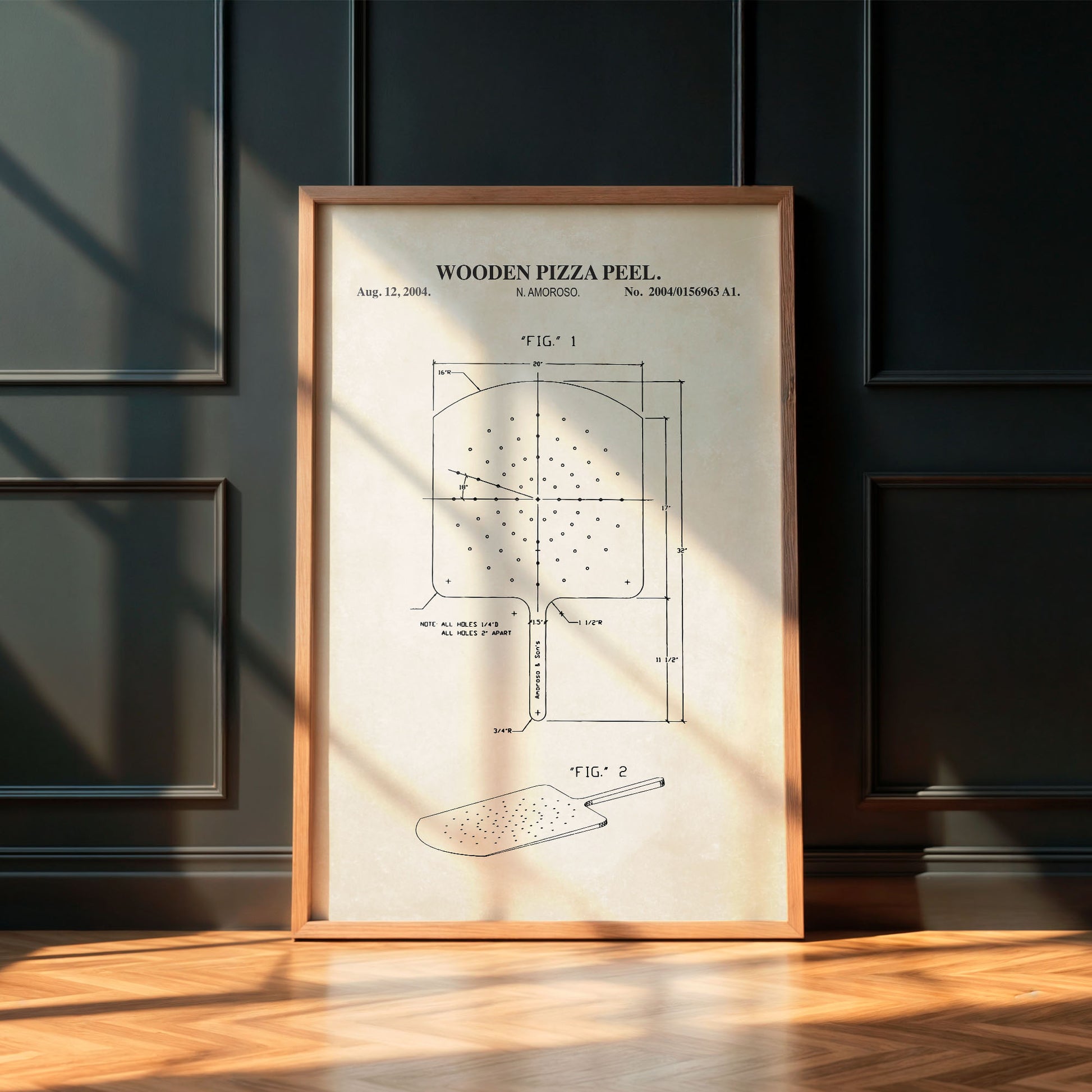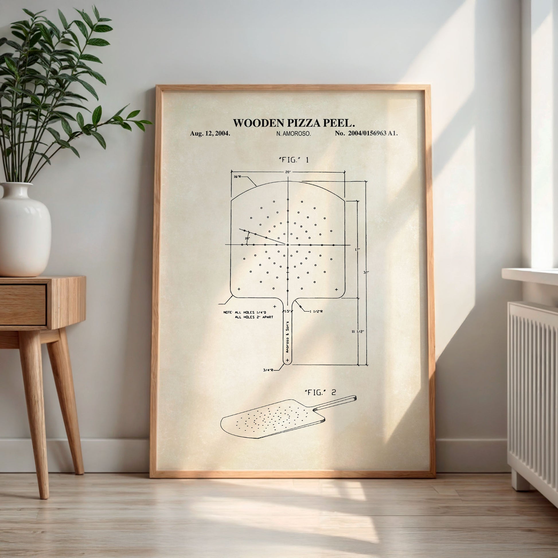 PRINTABLE PATENT WALL ART includes one (1) pizza peel print. Featuring a carefully restored high-resolution illustration from an original patent, this poster is ideal decor for any pizza enthusiast.