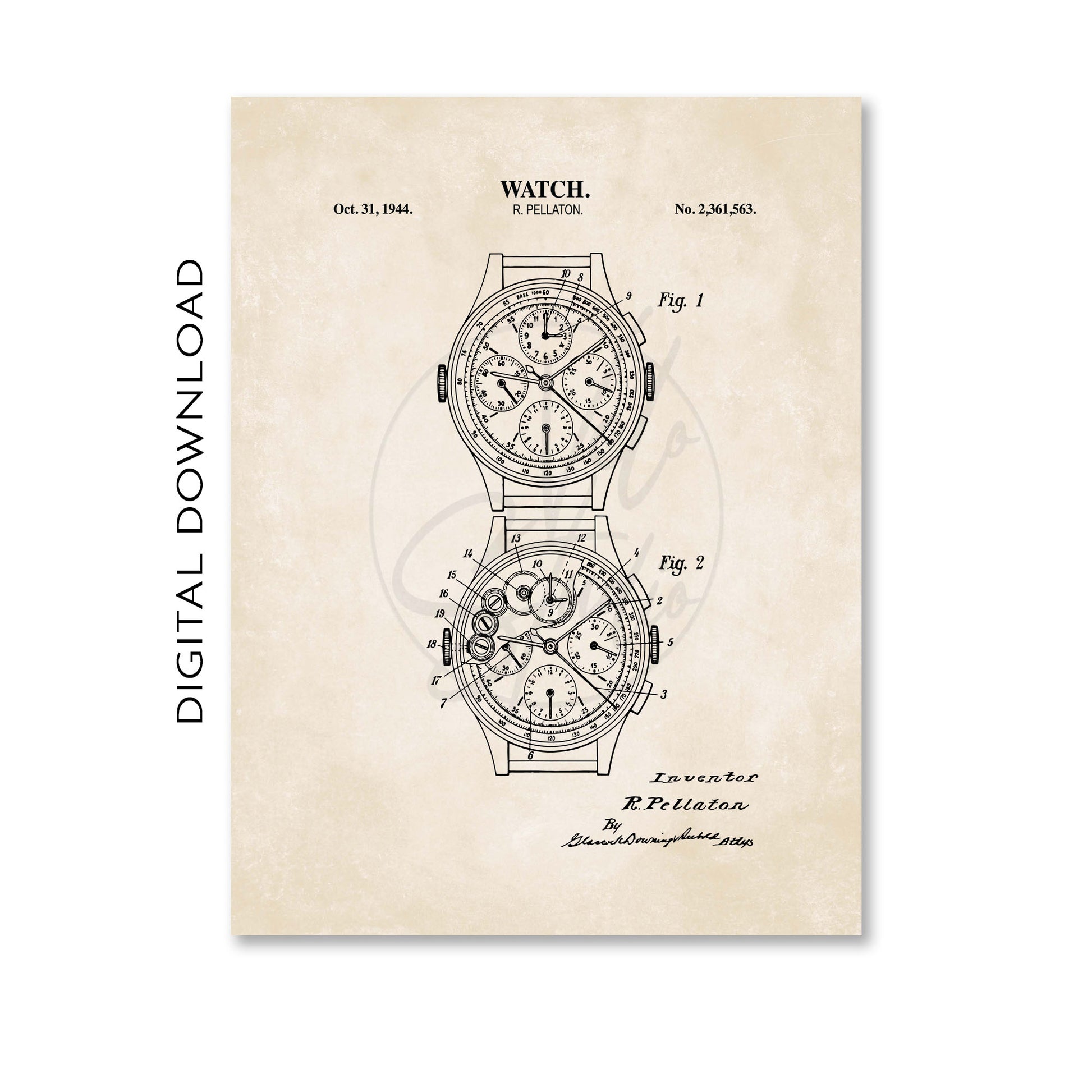 PRINTABLE PATENT WALL ART includes one (1) watch print. Featuring a carefully restored high-resolution illustration from an original 1944 patent, this poster is ideal decor for a watch enthusiast.