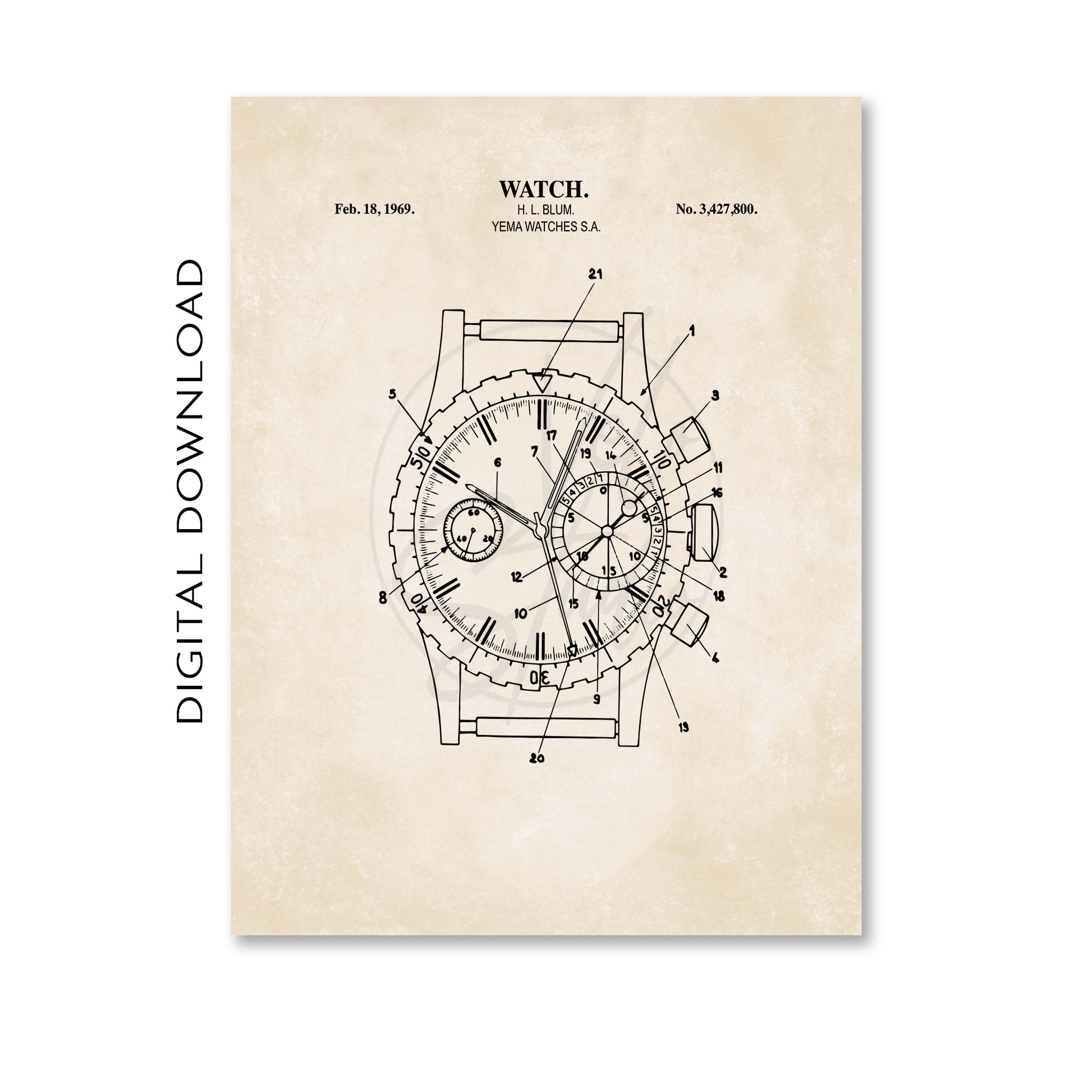 PRINTABLE PATENT WALL ART includes one (1) watch print. Featuring a carefully restored high-resolution illustration from an original 1969 patent, this poster is ideal decor for a watch enthusiast.