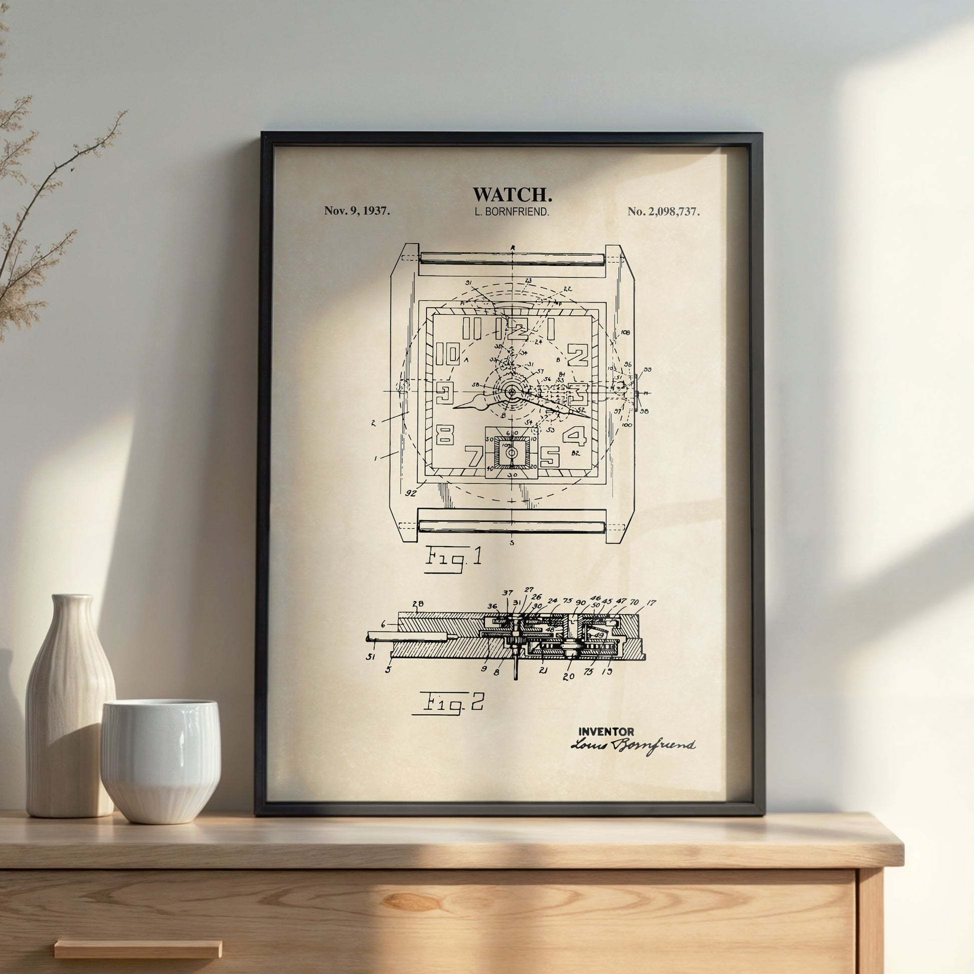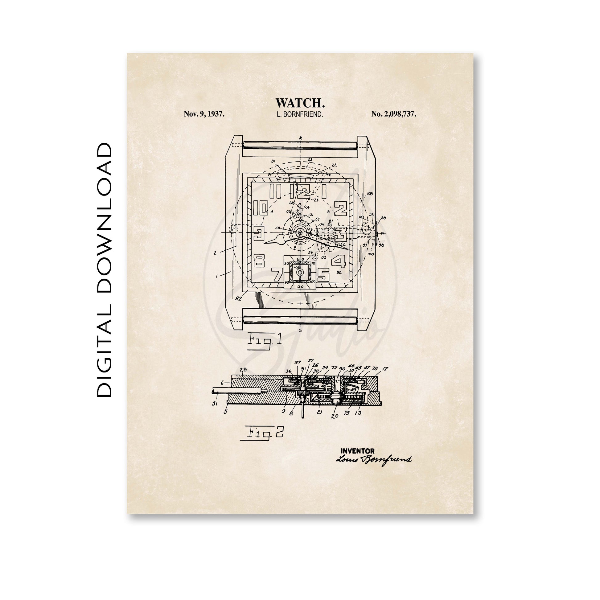 PRINTABLE PATENT WALL ART includes one (1) watch print. Featuring a carefully restored high-resolution illustration from an original 1937 patent, this poster is ideal decor for a watch enthusiast.